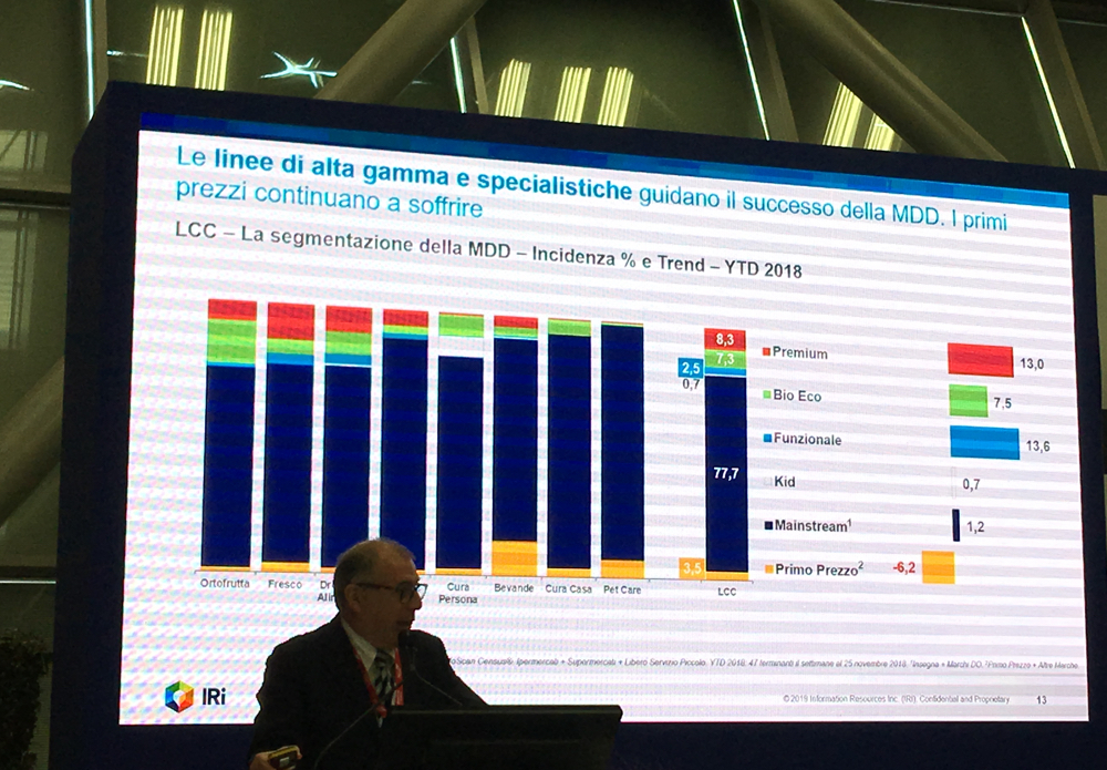 Lo scenario generale che emerge dal rapporto anche quest’anno è complessivamente positivo per la Marca del Distributore: nel 2018 i prodotti MDD, infatti,  complessivamente hanno generato 10.374 miliardi di euro di vendite, +2,5% a valore, +1,4% a volume, raggiungendo una quota del 19,3%. “Una media del pollo” dirà nella tavola rotonda successiva Mario Gasbarrino, amministratore delegato dei supermercati Unes/U2, sottolineando come in realtà in alcune insegne, come quella che diretta da lui, la media sia decisamente superiore.