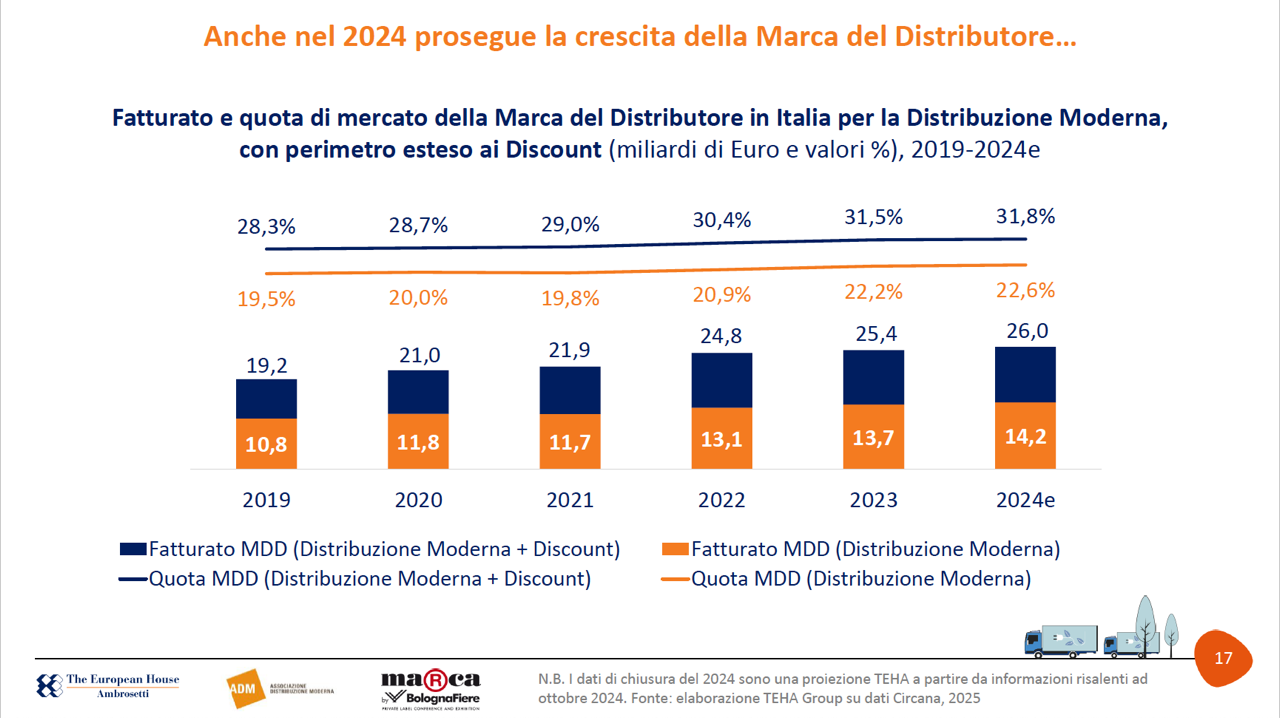 Nel 2024 i prodotti a marchio hanno fatturato 26,6 miliardi di euro, crescendo del 2,4% rispetto al 2023, con un aumento anche a volume (fonte dati: Circana) del 3,3%. È il risultato della somma sia dei prodotti a marchio della Gdo classica (14,2 miliardi) che dei Discount (12,4 miliardi) e che porta ad una quota complessiva che ora sale al 31,8%. Siamo ormai vicini alla media europea del 35,8%, che vede in testa paesi come la Svizzera (52,3%), la Spagna (45,6%) o i Paesi Bassi (45,2%)