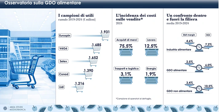 L’Area Studi Mediobanca presenta la nuova edizione dell’Osservatorio sulla Gdo italiana e internazionale a prevalenza alimentare che aggrega i dati economico-patrimoniali di 118 aziende nazionali e 30 maggiori player internazionali per il periodo 2019-2024. Per l’Italia la copertura è stimata pari al 95,8% del mercato.