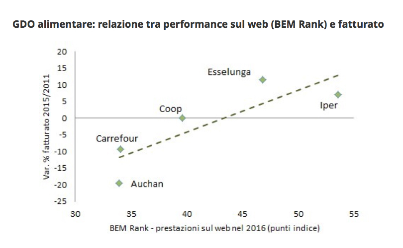 A fine 2016, sempre secondo la classifica stilata dalla società BEM Research, Iper la Grande I ed Esselunga si confermano le aziende della Gdo con le migliori per performance on line. Se ad aprile, però, le due catene erano appaiate in testa, a fine anno l'insegna del Gruppo Finiper stacca di 7 punti Esselunga. Coop, quarta nella classifica complessiva, è terza per quanto riguarda il mondo della Gdo alimentare.