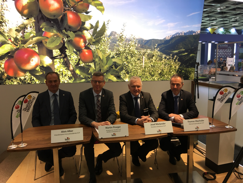 Nella conferenza stampa che si è tenuta a Berlino all'interno del grande stand che accoglie il mondo delle mele altoatesine, è stato il presidente Thomas Oberhofer ad annunciare il cambiamento, alla presenza del vice presidente Alois Alber e, naturalmente, dei due protagonisti di questo importante avvicendamento.