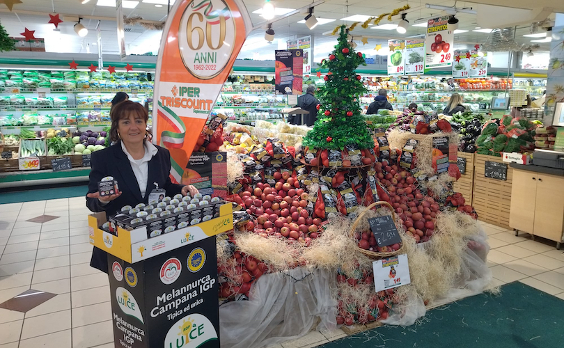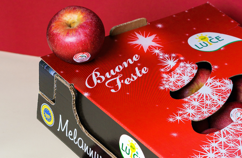 Anche nei reparti ortofrutta non mancano allestimenti a tema e, proprio in questo fine-settimana, ha preso avvio la commercializzazione della Melannurca Campana Igp di Aop Luce in veste natalizia.