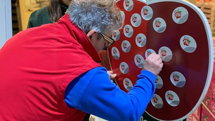 Per rendere ancora più ingaggianti le giornate promozionali, ecco prendere vita una novità: il Gratta e Vinci XXL che prevede un regalo immediato per tutti coloro che partecipano. Avvicinandosi al grande pannello, chi avrà acquistato il prodotto potrà grattare uno dei bollini presenti sulla grande mela sagomata e scoprire e aggiudicarsi uno dei premi brandizzati MelaPiù® da ritirare subito.