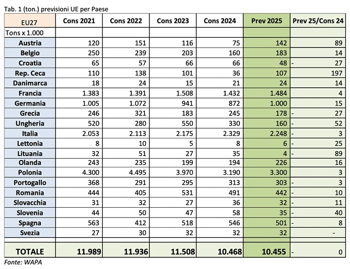La Polonia registra una ripresa dopo la scarsa produzione del 2024, con una stima di 3.300.000 tonnellate (+3%). Incrementi significativi si osservano anche in Germania (+15%) e in Francia (+4%), così come in Repubblica Ceca e in Austria dove si tornerà a livelli normali, dopo l’ultimo anno di considerevole calo.