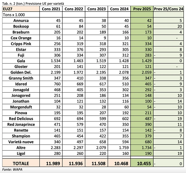 Le stime di produzione per il 2025 indicano un raccolto di mele in Europa che anche quest’anno sarà inferiore al potenziale storico di produzione, e che è stimato ad un totale di 10.455.000 tonnellate, un dato che quindi risulta sostanzialmente stabile rispetto allo scorso anno e inferiore del 7% rispetto alla media produttiva degli ultimi tre anni (Tab. 1).