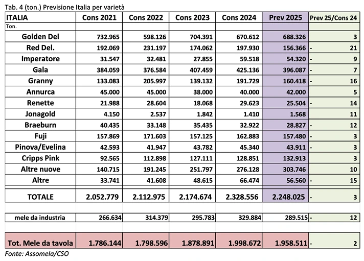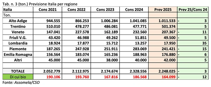 Per l’Italia, la produzione totale è stimata in 2.248.025 tonnellate, con un calo del 3% rispetto allo scorso anno (Tab. 3). A livello regionale, si registra un aumento della produzione in Trentino (+5%), mentre è previsto un leggero calo in Alto Adige (-3%) e nella maggior parte delle altre regioni.