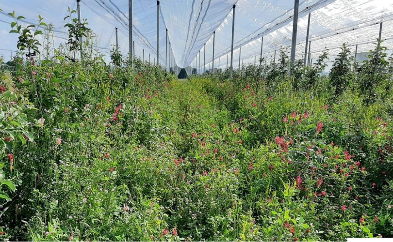 La particolarità che salta subito agli occhi nella visita al meleto è l’abbondante presenza di erbacee nell’interfila: le cover crops. La loro funzione? “Favoriscono la presenza di impollinatori e insetti utili. Le fioriture delle diverse varietà sono scalari e così come le fioriture delle cover crops”.