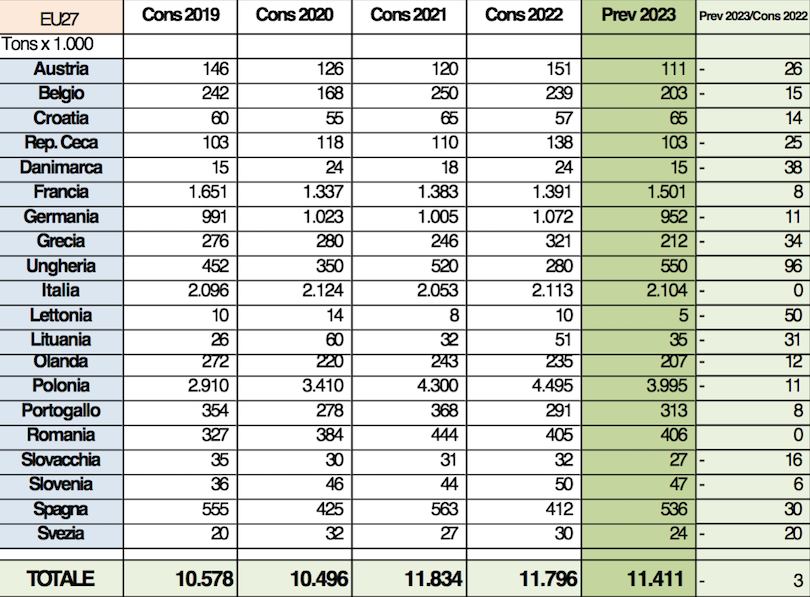 A eccezione di Italia e Francia, tutti i principali Paesi evidenziano una buona produzione. Il Belgio con circa 412mila tonnellate, potrebbe segnare un +20% sul 2022 e sul record produttivo. L’Olanda flette solo del 3% sul 2022, mantenendosi con circa 341mila tonnellate su un buon livello produttivo. La Spagna ritorna su una produzione normale dopo lo scarso 2022, con circa 296mila tonnellate. Il Portogallo segna solo un +4% sul 2022, rimanendo così su livelli inferiori alla norma con un’offerta che non arriva alle 140mila tonnellate. Da segnalare il trend di crescita della Polonia, arrivata nel 2023 a stimare circa 100mila tonnellate, il +5% sul 2022 e +30% sulla media degli ultimi tre anni.