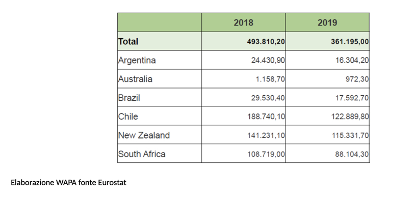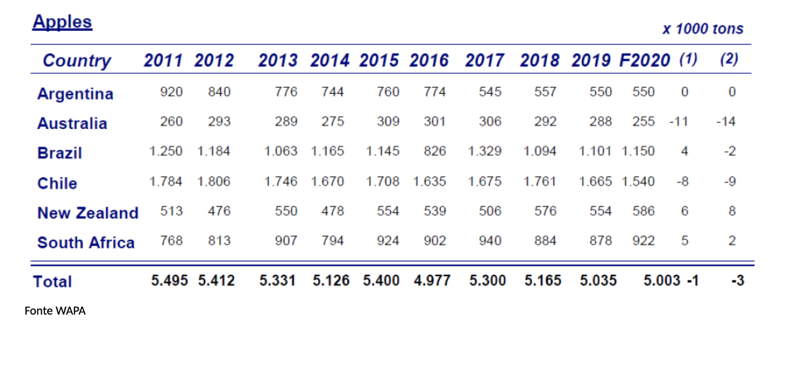 Per quanto riguarda la produzione dell'Emisfero Sud e in particolare le previsioni di export, anche in questo caso arrivano notizie che il Consorzio delle Organizzazioni di Produttori di mele italiani giudica positive per il nostro paese. Secondo i dati WAPA, infatti, la produzione dei paesi dell’emisfero Sud “dovrebbe essere in linea con quella degli anni precedenti, superando di poco le 5 milioni di tons”. Le esportazioni dovrebbero rimanere stabili a avvicinarsi ai 1,7 milioni di tonnnellate. “La grande differenza rispetto al passato – conclude Assomela – sta però nel fatto che la quota di prodotto destinata all’Europa, come accade da qualche anno a questa parte, si prevede ulteriormente a ribasso“.