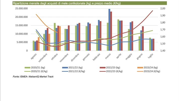 Quanto ai prezzi, le prime battute della campagna commerciale 2024/25 sono state caratterizzate da quotazioni all'origine stabili su base annua ma in aumento rispetto ai prezzi medi dell'ultimo triennio.