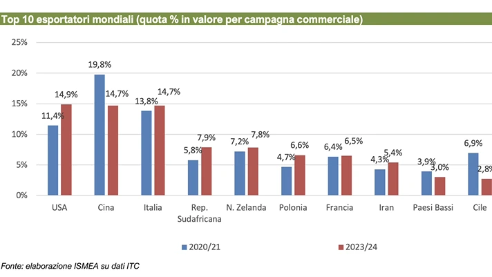 Nella campagna 2023/24, in termini di valore, le esportazioni dell’Italia sono ripartite tra area Ue 63% e area Extra Ue 37 per cento. La Germania si conferma come il primo cliente del nostro Paese con una quota del 30% delle esportazioni complessive grazie ad un aumento del 22% dei quantitativi inviati e del 39% degli introiti rispetto alla campagna 2022/23.
