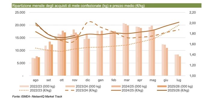 I dati Ismea-NIQ degli acquisti di mele – sia sfuse sia confezionate - per il consumo domestico della campagna commerciale 2024/25 (da agosto a luglio) evidenziano una lieve riduzione (-3%) rispetto alla campagna precedente. Di contro, il prezzo medio al dettaglio è cresciuto del 2 per cento, mentre la spesa delle famiglie è diminuita dell’1,3.