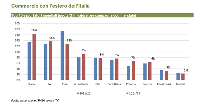 Questo risultato è dovuto esclusivamente alla crescita dei volumi esportati (+24%), mentre il prezzo medio all’export è diminuito di 4 centesimi al chilo (-3,7%). Grazie a questi numeri, l’Italia ha conquistato la prima posizione tra gli esportatori mondiali, superando Stati Uniti e Cina.