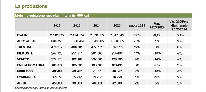 Non emergono variazioni significative del potenziale produttivo rispetto al 2024, né rispetto alla media dell’ultimo triennio. Per il 2025, Assomela stima una produzione nazionale di 2.317.545 tonnellate, un valore in linea con quello dell’anno precedente e superiore di circa il 5% alla media 2022‑2024.