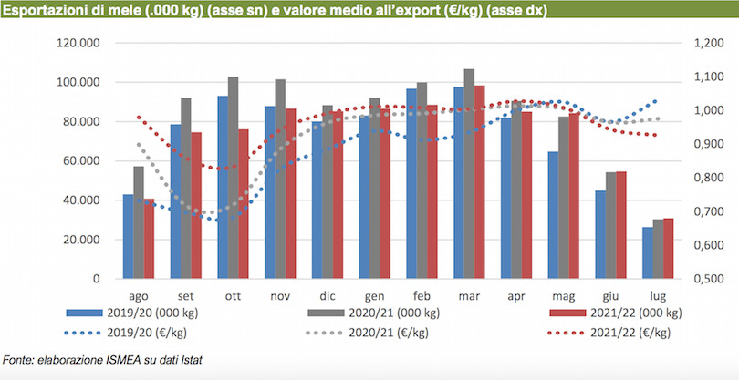 Quanto agli scambi con l'estero, la campagna 2021-22 si è chiusa con un peggioramento del saldo della bilancia commerciale delle mele rispetto alla campagna precedente, sebbene lo stesso resti ampiamente positivo. La mela è infatti il prodotto ortofrutticolo italiano che vanta il miglior saldo della bilancia commerciale.