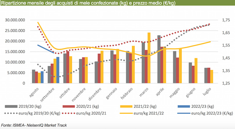 E, infatti, nei primi due mesi della campagna commerciale 2022-23, gli acquisti al dettaglio di mele confezionate registrano un aumento in volume (+6,9%) accompagnato da una flessione del prezzo medio (-4,1%). Particolarmente positiva la vendita di mele bio: +11,2% in volume.