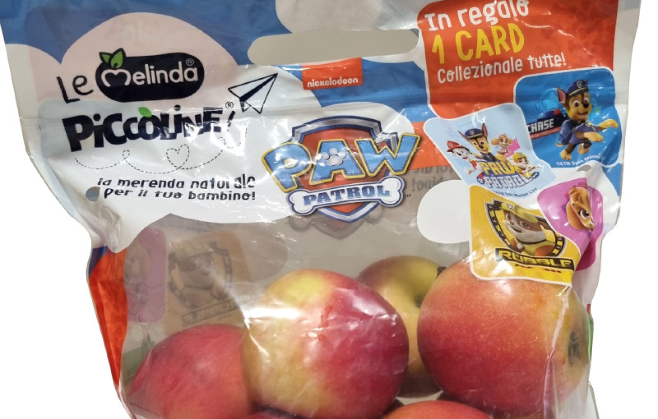 Già lanciati nel 2021, gli esemplari – delle varietà Morgana e Tessa – tornano sugli scaffali a partire dalla metà di aprile accompagnati anche quest'anno da un gruppo di testimonial d'eccezione: i cuccioli di Paw Patrol, la celebre e amatissima serie animata canadese. Sono loro, infatti, i protagonisti della confezione da 1 kg e della sorpresa custodita al suo interno, ovvero una card da collezionare. Le mele sono vendute in borse riutilizzabili nel rispetto della filosofia circolare di Melinda che ambisce a minimizzare gli sprechi favorendo il riuso.