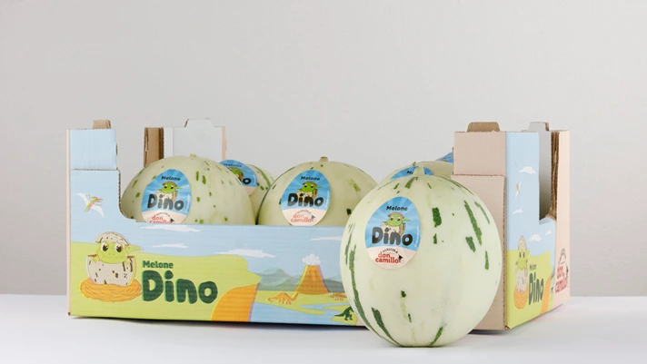"La grafica ricca dei colori tipici di un paesaggio preistorico cattura l’attenzione e rende accattivante il packaging del Melone Dino all’interno del punto di vendita".