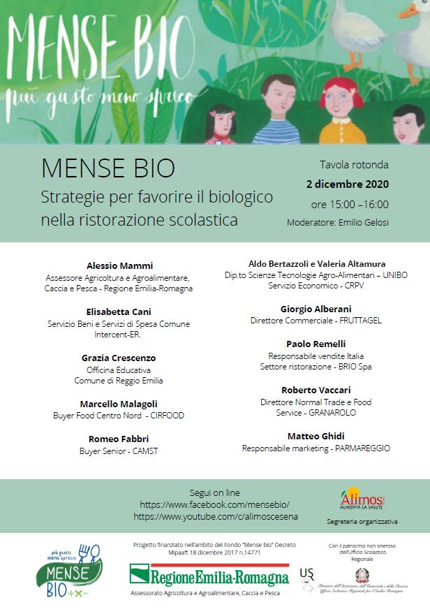 I due incontri saranno trasmessi on line su facebook e youtube. Per saperne di più e scaricare i materiali didattici del progetto https://agricoltura.regione.emilia-romagna.it/notizie/2020/ottobre/mense-bio-piu-gusto-meno-spreco e anche https://alimos.it/project/mense-bio/