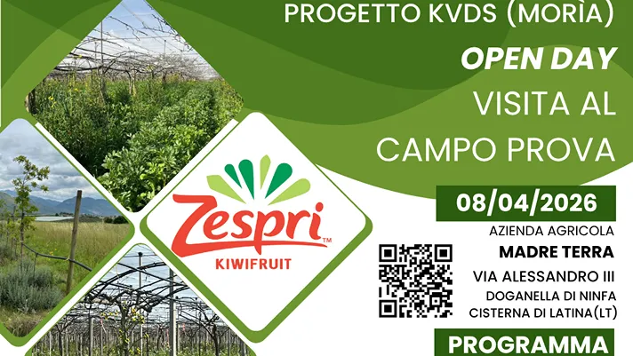 Zespri invita tecnici, aziende agricole, operatori del settore e stakeholder interessati a partecipare all’open day del progetto Kvds (moria), in programma mercoledì 8 aprile 2026, dalle 15:30 alle 18:00, al campo prova dell’azienda agricola Madre Terra (via Alessandro III) a Doganella di Ninfa, nel comune di Cisterna di Latina (Latina).