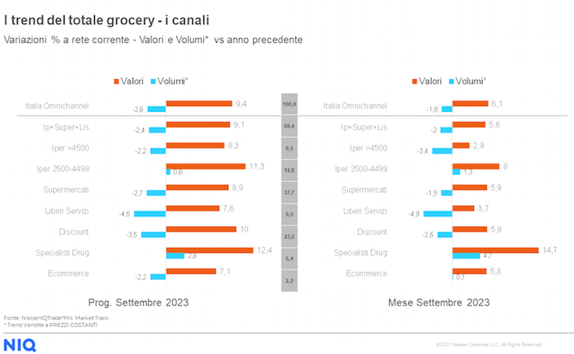 Rispetto allo stesso periodo del 2022, l’indagine di NielsenIQ sottolinea un andamento positivo per tutti i canali distributivi. Nello specifico, la crescita è guidata da specialisti drug (+14,8%), seguiti da superstore (+8,8%), discount (+7,9%), supermercati (+5,9%), liberi servizi (+4,3%) e infine iper con superficie maggiore di 4.500 metri quadrati (+2,8%).