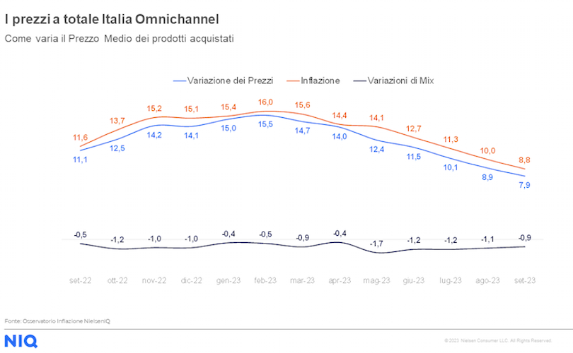 Per quanto riguarda l’indice di inflazione teorica nel Largo consumo confezionato (Lcc), si evidenzia una diminuzione ulteriore pari al 8,8%, un dato inferiore rispetto a quello osservato ad agosto (10%). Per contrastare l’impatto dell’inflazione, gli italiani continuano ad adottare comportamenti di acquisto al risparmio, riducendo ulteriormente il mix del carrello della spesa dello 0,9%. Ciò ha reso la variazione reale dei prezzi pari al 7,9 per cento.