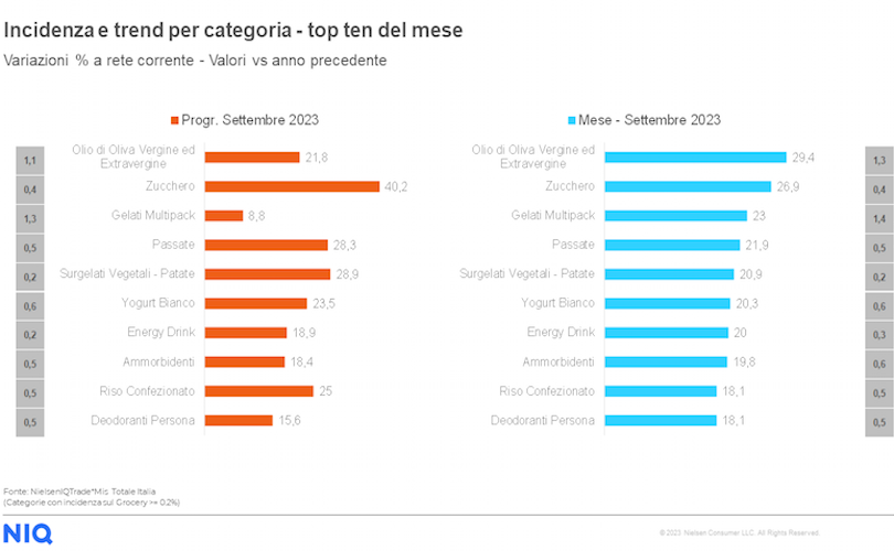 A livello di categorie merceologiche, guidano la classifica Top10 del mese di settembre 2023 l’olio di oliva vergine ed extravergine (+29,4%), lo zucchero (+26,9%) e i gelati multipack (+23%).