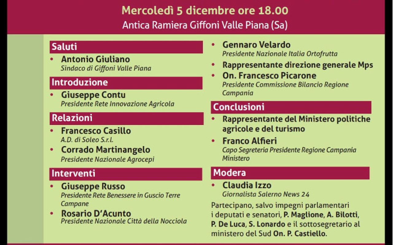 La nocciola torna protagonista di un convegno, in programma all’Antica Ramiera di Giffoni Valle Piana nella giornata di mercoledì 5 dicembre, a partire dalle 18. Il tema all’ordine del giorno, in particolare, sarà: “Il contratto di filiera nazionale. Innovazione in guscio: un’opportunità per i nostri territori”. Dopo i saluti del sindaco, Antonio Giuliano, e l’introduzione di Giuseppe Contu, presidente di Rete Innovazione Agricola, seguiranno le relazioni di Francesco Caillo, ad di Soleo srl, e di Corrado Martinangelo, presidente nazionale di Agrocepi. Sono poi previsti gli interventi di Giuseppe Russo, presidente di “Rete benessere in guscio terre campane”, di Rosario D’Acunto, presidente nazionale dell’associazione “Città della nocciola”, di Gennaro Velardo, presidente nazionale Italia Ortofrutta, di un rappresentante della direzione generale Mps e dell’on. Francesco Picarone, presidente della Commissione Bilancio della Regione Campania.