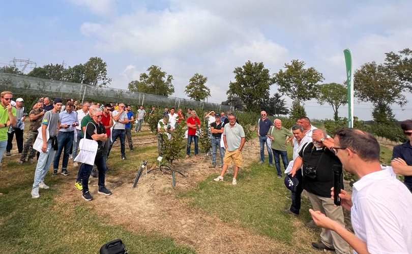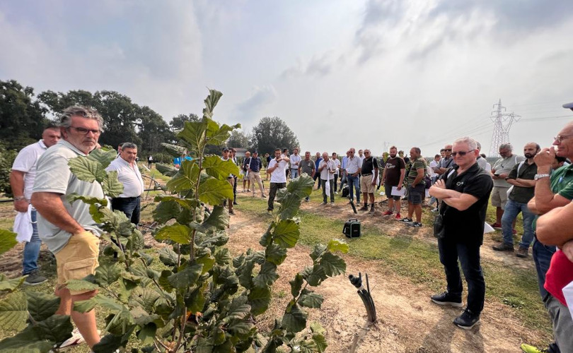Scendendo poi sul tecnico, Babini prosegue: “Presso il campo sperimentale della Fondazione per l’agricoltura F.lli Navarra abbiamo impiantato da due anni, su un ettaro di superficie, 13 diverse varietà di nocciolo, alcune piuttosto comuni, altre molto rare in Italia. Abbiamo potuto mostrare ai visitatori come, già al secondo anno, le piante presentino un ottimo vigore. Alcune di esse raggiungono già altezze attorno a 1,80 metri. E tutto ciò senza forzare con la concimazione e trovandoci peraltro su un terreno non ideale, essendo molto argilloso“.