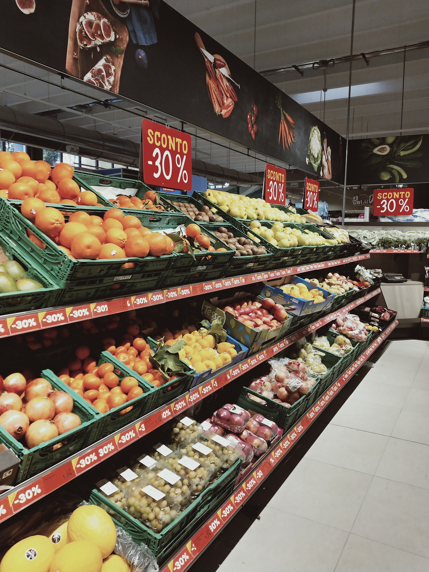 Aldi BolognaLa prima tappa, obbligatoria all'ingresso, è il reparto di frutta e verdura. Ci accoglie la gigantografia di Barbara Baccarini, imprenditrice agricola di Faenza (Ravenna) in posa con i suoi frutti. Assortimento abbastanza completo con 120 referenze tra frutta e verdura e oltre 30 marche esclusive. C'è tanta Italia: dall‘arancia rossa di Sicilia con il bollino del consorzio di tutela Igp ai mandarini tardivi, poi le fragole, le mele, i kiwi, i pomodori. A cui si aggiunge una grande varietà di verdure. Buono lo spazio dato alla frutta esotica oltre le tradizionali banane ci sono  mango, papaya, avocado e noce di cocco.