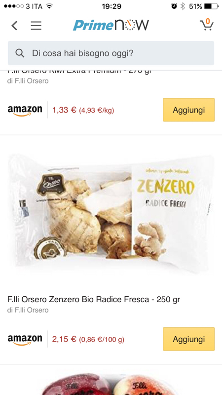 Una finestra a partire dall'Home Page di Amazon Prime Now, poi la possibilità di acquistare alcune referenze (al momento della nostra ricerca erano presenti 7 referenze a marchio Orsero): una referenza della nuova linea “Maturi al punto giusto”, vale a dire la papaya (400 gr a 2,81 euro), poi l'ananas (1400 gr a 2,73 euro), la confezione da tre kiwi extra premium (270 gr a 1,33), la radice di zenzero fresco bio (250 gr a 2,15 euro), il vassoio da 4 mele (2,21 euro), la radice bio di curcuma (125 gr a 1,64 euro) e infine il tris di pompelmi (750 gr a 2,15 euro).