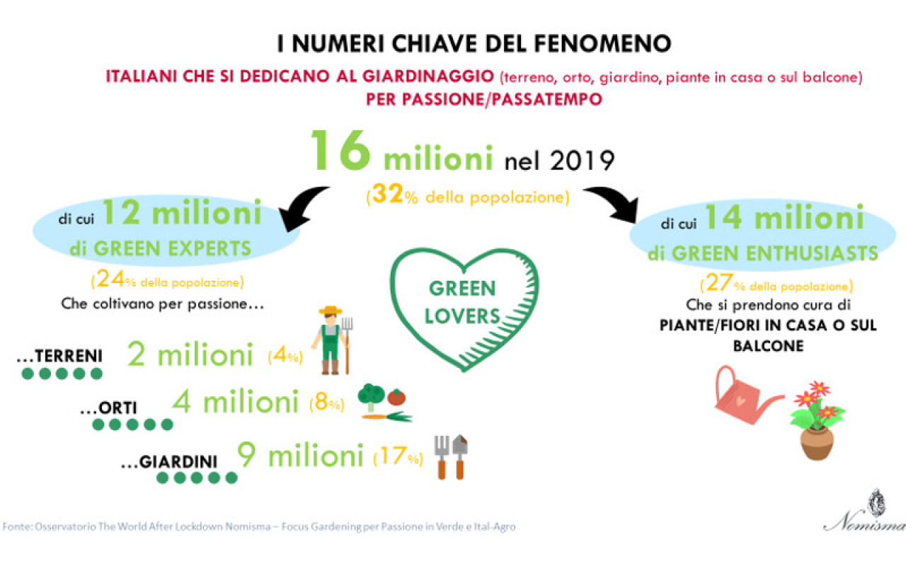 Immaginando un ritorno alla normalità, secondo le previsioni saranno 17 milioni (34% della popolazione) gli italiani che continueranno a coltivare la passione per il verde, prendendosi cura di un terreno, di un orto o dedicandosi alla manutenzione del giardino o delle piante in casa e in balcone.