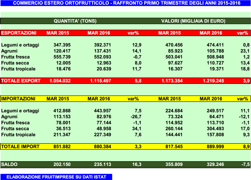 Per quanto riguarda le importazioni l’Italia ha importato circa 880 mila tonnellate di ortofrutticoli per un valore di 890 milioni di €.