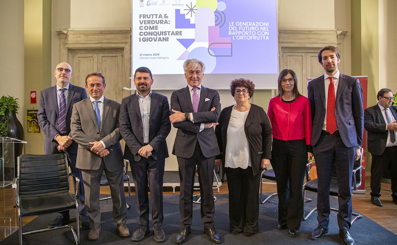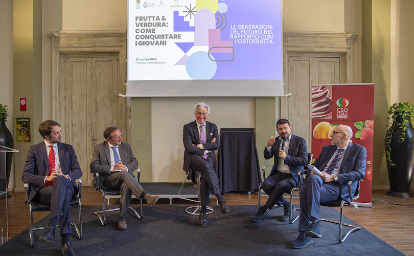 Da sinistra a destra: il direttore di Fruitimprese, Pietro Mauro; il presidente di Aci, Davide Vernocchi; l’assessore regionale all’Agricoltura dell’Emilia-Romagna, Alessio Mammi; il presidente di Cso Italy, Paolo Bruni; la direttrice di Cso Italy Elisa Macchi; Francesca Ansaldi dell’Istituto Piepoli; il direttore di Assomela, Giovanni Missanelli