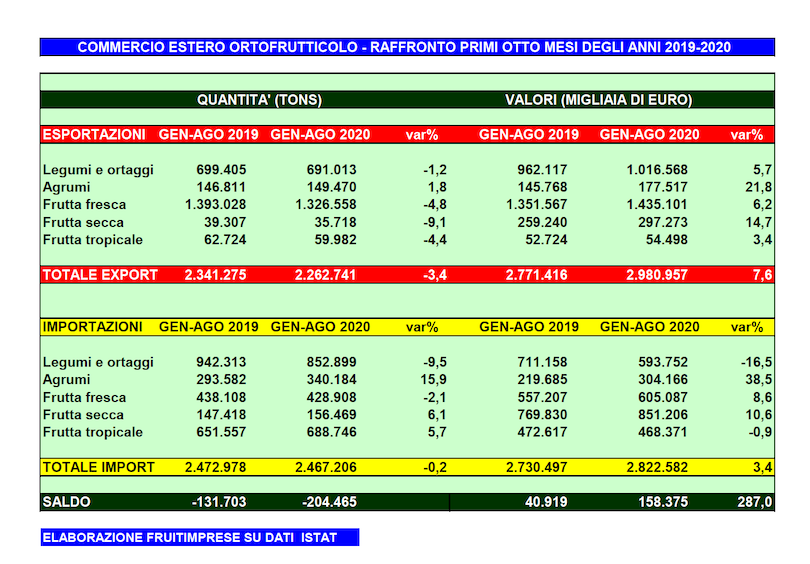 Il 2020 per l’export di ortofrutta chiuderà col segno più a valore ma col segno meno in quantità. Marco Salvi, presidente nazionale Fruitimprese, commenta i dati del terzo trimestre dell’anno che va a chiudersi. “La tendenza dei primi nove mesi dell’export (a settembre +7% a valore, -3,6% in quantità) si dovrebbe confermare, paghiamo la scarsità di produzione del 2019 che ha condizionato anche le vendite del primo semestre 2020. Nell’import le quantità si mantengono, a valore stiamo crescendo quindi il saldo attivo della bilancia commerciale è in costante riduzione anno dopo anno. Una tendenza che si può invertire solo lavorando sulla competitività del Paese e delle nostre imprese con interventi strutturali. Cresciamo su prodotti di alta qualità e varietà club (mele, uva, ecc) però essendo noi un paese leader anche nella produzione abbiamo bisogno di poter valorizzare anche i prodotti standard, ma sulle commodity siamo perdenti perché il mercato si sposta su altri paesi per una questione di costi”.