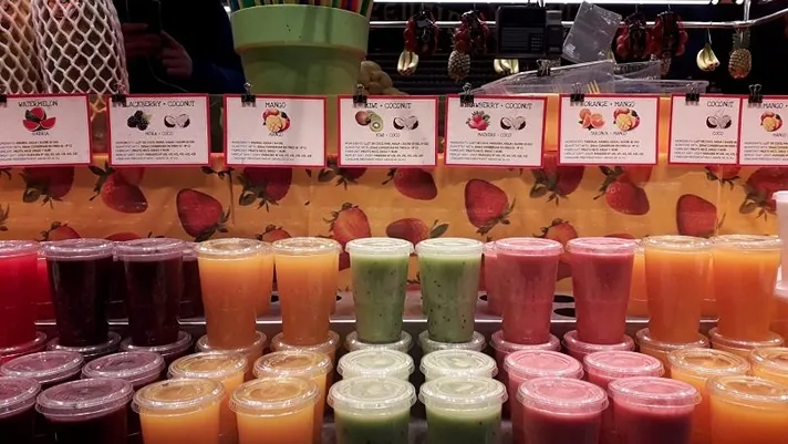 Si può iniziare la mattina con un zumo di mango, passion fruit o fragola sorseggiato direttamente al mercato, ma c'è pure la versione take away per chi ha fretta, e prima di uscire fare scorta di mele e altra frutta da passeggio oppure per l'ufficio. Si può fare un salto o pranzo o per la cena magari a base di pesce, innaffiata da un buon vino, e visto che si è ad un passo di banchi si prende un melone da associare agli spiedini di prosciutto iberico.