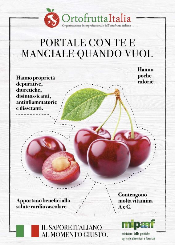 É partita ieri, 3 giugno, la campagna comunicazione di Ortofrutta Italia, l'iniziativa si articolerà in tutto il territorio nazionale, focalizzata nel mese di giugno sulle ciliegie, in alcune migliaia di punti di vendita di tutte le maggiori catene della distribuzione moderna e nei negozi del dettaglio specializzato con la partecipazione di tutta la filiera produttiva e commerciale.