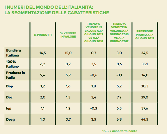 La discriminante ricercata riguarda il riferimento all'Italia: sono entrati nel paniere 19.228 prodotti, sui quali sono stati rilevati nessi con le regioni italiane, simboli riecheggianti il tricolore, connessioni con l'origine nei grandi classici “made in Italy“, “product in Italy“, “solo ingredienti italiani“, “100% italiano“, oltre ai marchi Dop, Igp, Doc e Docg. E' risultato che il richiamo esplicito all’Italia aumenta le vendite: a fronte di una crescita dei prodotti genericamente italiani pari al +1.9%, i prodotti “100% italiani” e con certificazioni di italianità crescono invece del +4,8%. A confermare questa tendenza anche uno studio di Nielsen, secondo il quale il 75% degli italiani è disposto a spendere di più per avere la certezza dell’origine italiana dei prodotti; l’80% degli italiani ritiene che l’origine delle materie prime dei prodotti debba essere facilmente leggibile sul packaging; il 78% degli italiani afferma di sentirsi rassicurato dalla certificazione di origine 100% italiana.