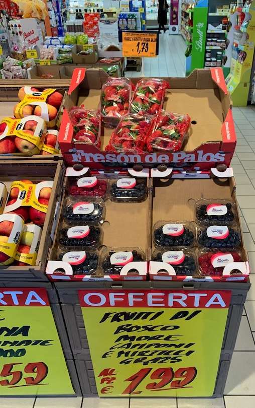 La rilevazione dell'Osservatorio Piccoli frutti ieri, 18 marzo, ha interessato la zona urbana di Padova dove sono stati visitati 22 punti di vendita di 22 insegne appartenenti a 13 gruppi della grande distribuzione organizzata. In particolare, i rilievi sono stati condotti nei pdv delle seguenti insegne: Alì, Alìper, Carrefour, Conad City, Conad Superstore, Coop, Crai, Despar, Eurospar, Famila, iN's, inCOOP, Iper Spar, Iperlando, Lidl, MD, Pam, Pam Local, Prix, Spak, Spazio Conad, Super A&O.