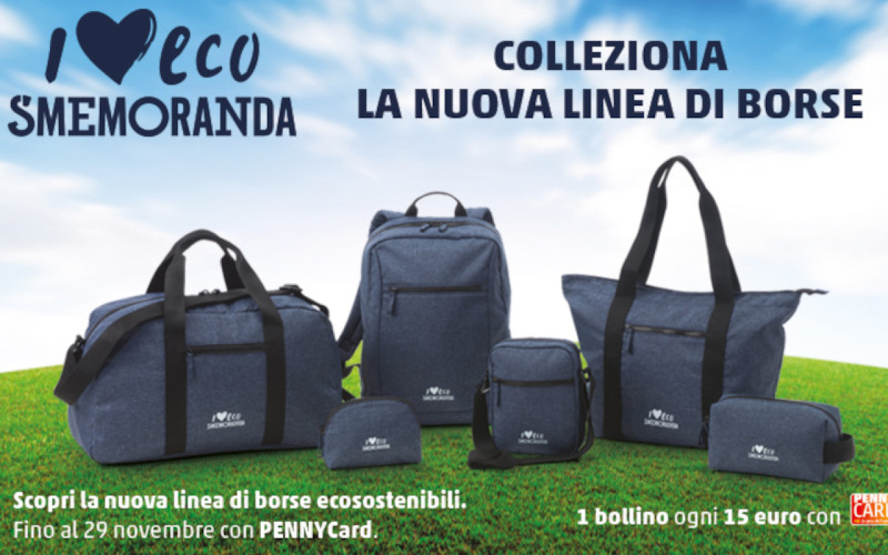 “Dalla borsa a tracolla al beauty case, dal pratico borsone da viaggio allo zaino e alla shopping bag – spiega una nota aziendale – la nuova collezione “I Love Eco”, in 100% pet riciclato, è dedicata a tutti coloro che hanno a cuore la salvaguardia dell’ambiente senza rinunciare al design e alla filosofia Smemoranda”. Riservata ai possessori di Penny Card, l’iniziativa sarà attiva fino al 29 novembre. Confermato il format delle collezioni Penny, basato sul sistema della raccolta bollini; un bollino ogni 15 euro di spesa con PennyCard e, raccolti i bollini necessari, i prodotti possono essere ottenuti gratuitamente o tramite contributo.