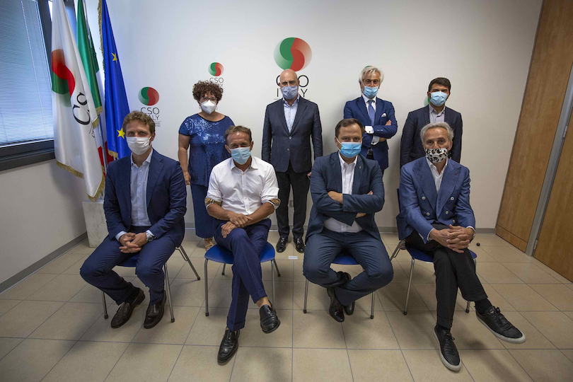 Da sinistra in piedi, Elisa Macchi, Stefano Bonaccini, Paolo Bruni, Alessio Mammi, Luigi Mazzoni, Davide Vernocchi, Ilenio Bastoni, Marco Salvi