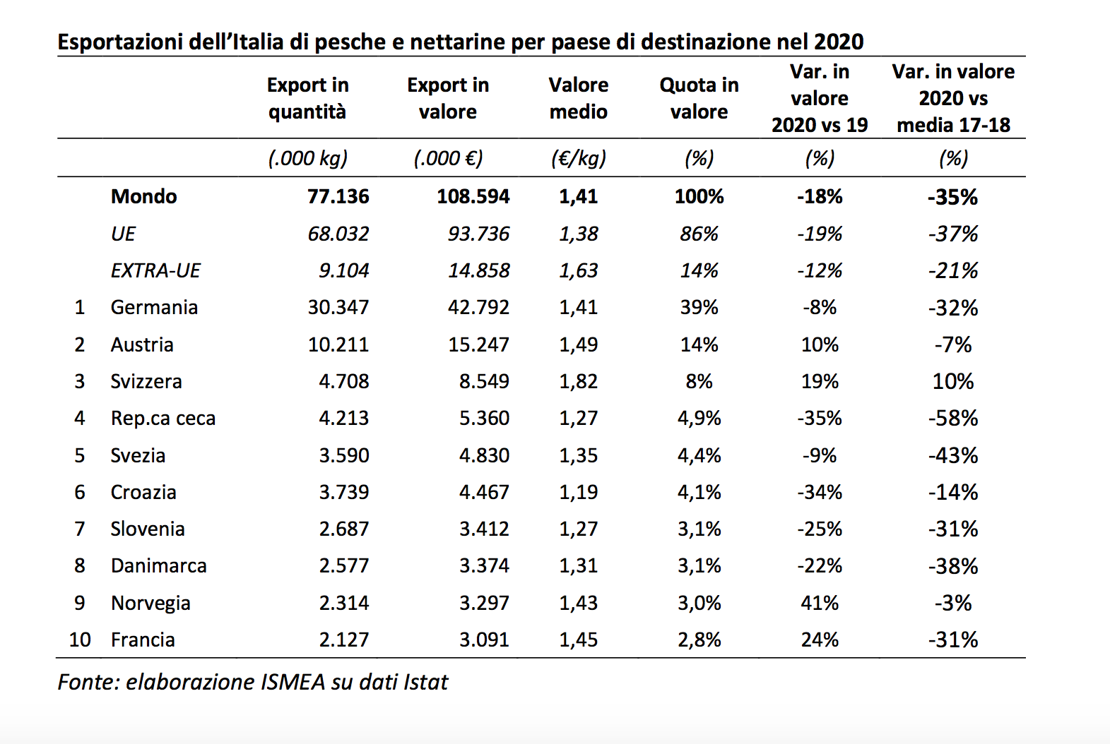 Analizzando nel dettaglio l'export, la situazione appare la seguente. Nonostante il buon livello quantitativo e qualitativo delle produzioni italiane, che vanno dalle precoci della Basilicata, a quelle estive delle regioni settentrionali (Emilia-Romagna, Piemonte e Veneto) e meridionali (Campania, Calabria e Puglia), fino a quelle tardive siciliane, si assiste anno dopo anno al progressivo assottigliamento delle esportazioni e all’aumento delle importazioni, soprattutto di prodotto spagnolo precocissimo e precoce. Il saldo della bilancia commerciale è dunque in caduta libera: negli ultimi quattro anni passa da un attivo di 77 milioni del 2017 a un passivo di 14 milioni nel 2020. In particolare, il saldo della bilancia commerciale del 2020 evidenzia una flessione in valore del 135% rispetto all’anno precedente. E il 2021? Secondo Ismea sarà anche peggio del 2020 per via delle produzioni scarse che determineranno un incremento delle importazioni e una riduzione delle spedizioni all’estero.