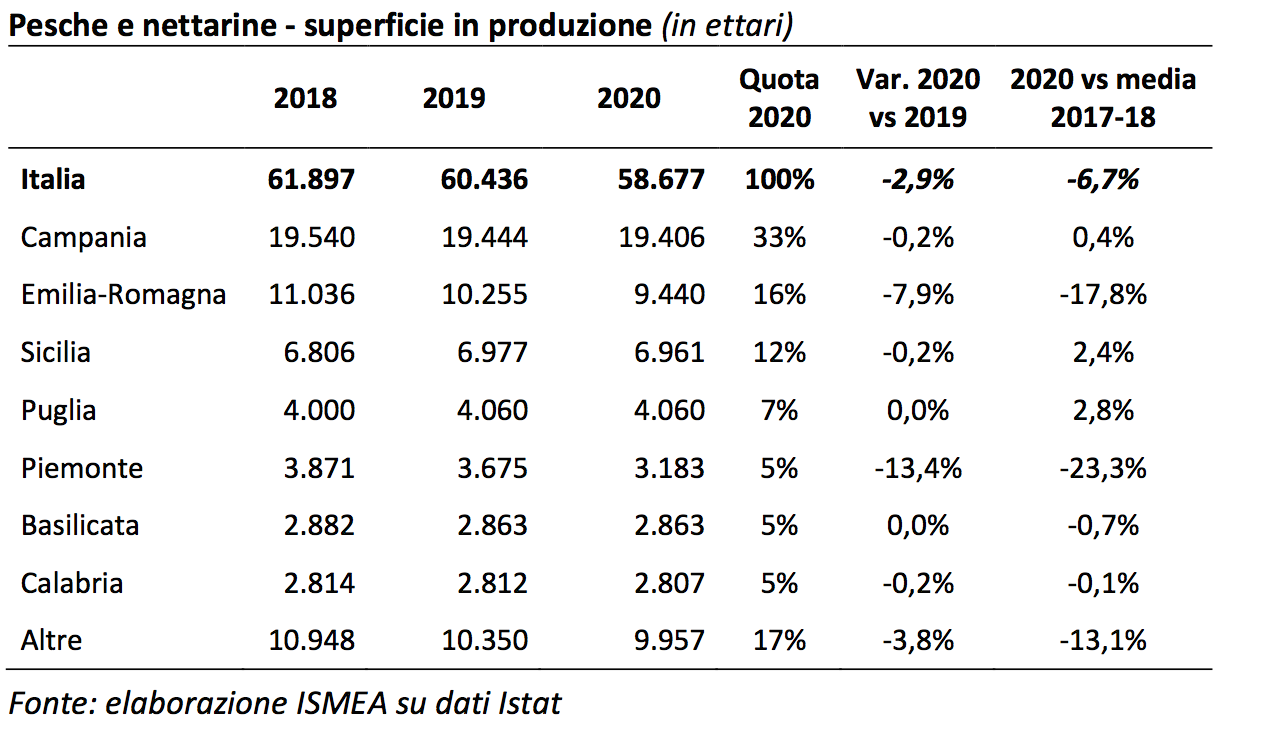 E' infine confermata la tendenza strutturale alla riduzione degli investimenti: la superficie produttiva italiana, circa 59mila ettari di cui il 70% coltivato a pesche e percoche e il restante 30% a nettarine, nel 2020 è diminuita del 3% rispetto al 2019 e del 6,7% rispetto al dato medio del biennio 2017/18. La flessione rispetto al 2019 è particolarmente accentuata nelle regioni del nord Italia: -8% in Emilia-Romagna (con -11% nella provincia di Ravenna), -13% del Piemonte (con -16% nella provincia di Cuneo) e -15% del Veneto. Il calo degli investimenti è più contenuto in Campania, Calabria e Sicilia, mentre le superfici in produzione restano stabili in Puglia e Basilicata.