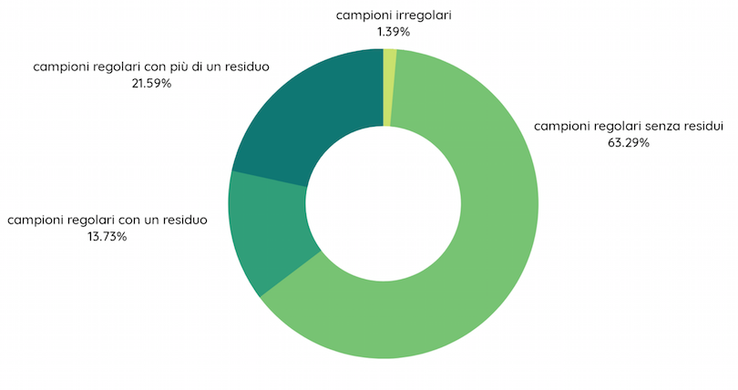 Per realizzare il dossier sono stati analizzati 2.519 campioni di alimenti di origine vegetale: la percentuale di irregolari è molto bassa (1,39%), mentre è alta (63,29%) la percentuale di campioni privi di residuo o con un quantitativo entro i limiti di legge.