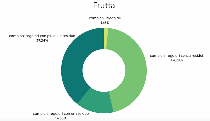La maggiore concentrazione di residui è stata rilevata nella frutta: i fitofarmaci sono presenti nell’uva da tavola (85,71%), nelle pere (82,14%), nelle fragole (71,79%) e nelle pesche (67,39%). Le maggiori irregolarità si riscontrano negli agrumi, nei piccoli frutti e nella frutta esotica.
