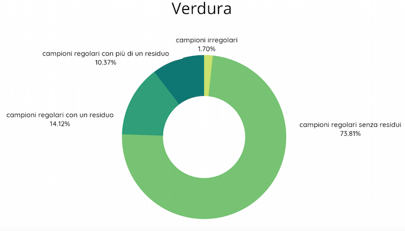 Va meglio alla verdura: il 73,81% degli ortaggi è risultato senza residui (73,81%), eccezion fatta per pomodori e peperoni, che hanno elevate quantità di fitofarmaci, rispettivamente 60,20 e 48,15% dei campioni analizzati.