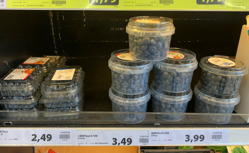 Il 58% delle referenze rilevate nel prodotto mirtilli è venduto in confezioni di peso netto pari a 125 grammi.