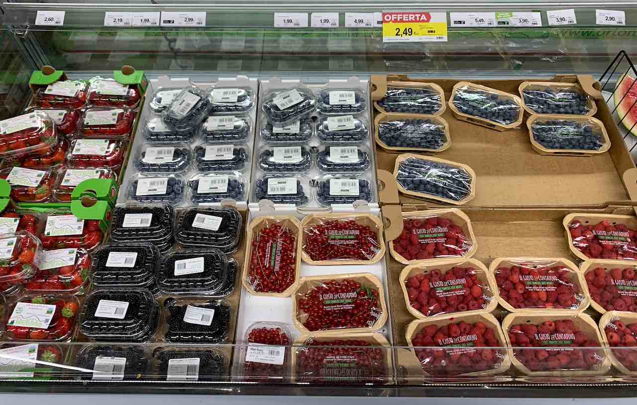 A Trento gli scaffali risultano ben forniti, buona la qualità anche per il prodotto tardivo italiano. I mirtilli arrivano perlopiù da Italia e Polonia, i lamponi da Italia e Portogallo, le more dall'Italia. Pochi i brand, i prezzi sono medio-bassi con molte promozioni, soprattutto sui mirtilli.