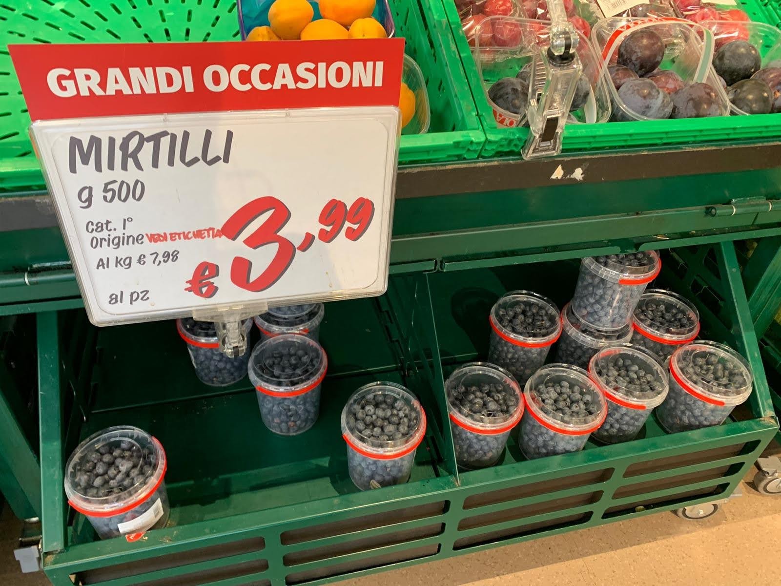 Tra gli appunti dei rilevatori, vanno segnalate le numerose promozioni, Lidl su tutti con 125 grammi di mirtilli a 0,79 euro. Mirtilli che peraltro risultano proposti in molti formati: 125/170/200/250/300 e 500 grammi!