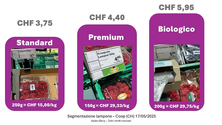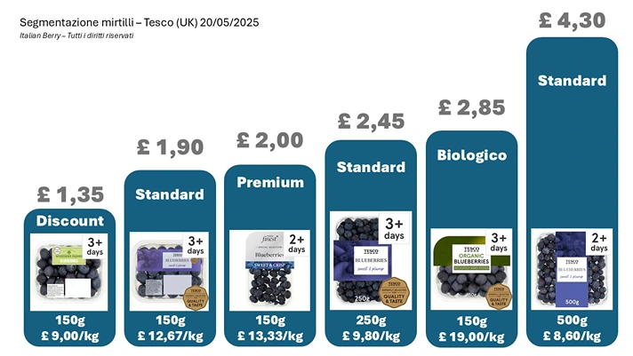 Tuttavia, la realtà italiana è in generale ancora molto lontana da questa strategia. La nostra analisi "I mirtilli sono tutti uguali"– volutamente senza punto interrogativo – ha evidenziato come l'89% delle referenze sul mercato italiano nel 2024 fosse classificato come standard.